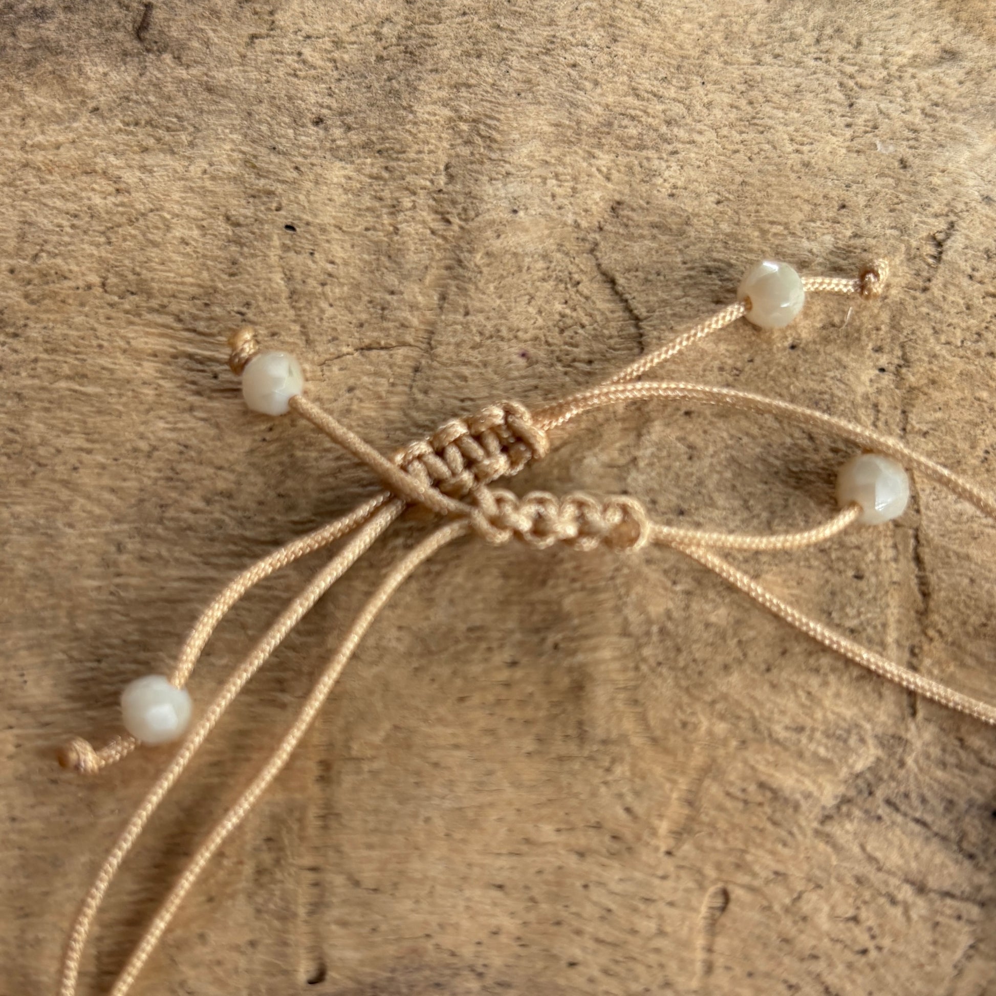 Tan gold string, knotted, glass beads, with a big heart charm. These bracelets have an adjustable sliding knot. max 23 cm