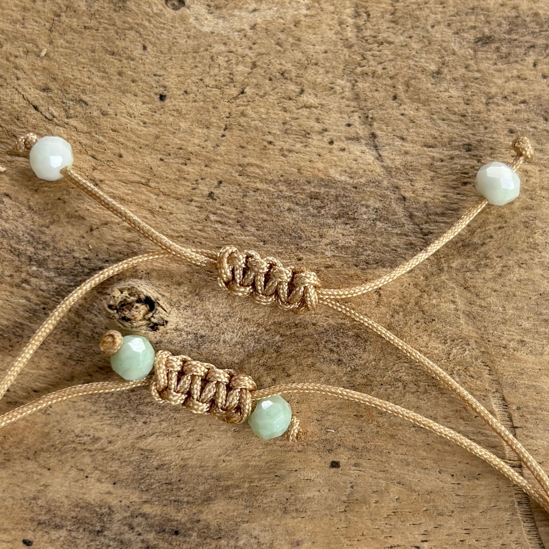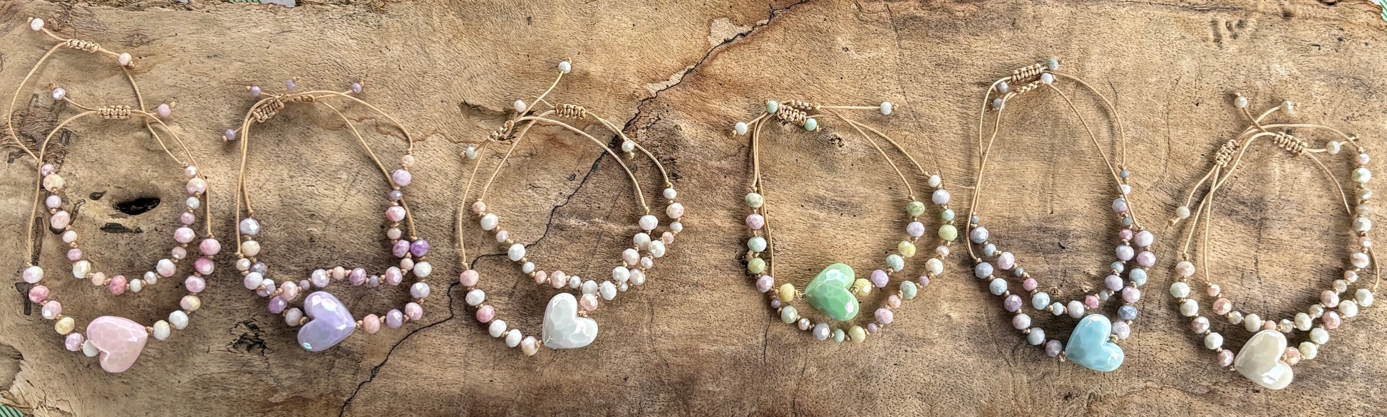 Tan gold string, knotted, glass beads, with a big heart charm. These bracelets have an adjustable sliding knot. max 23 cm