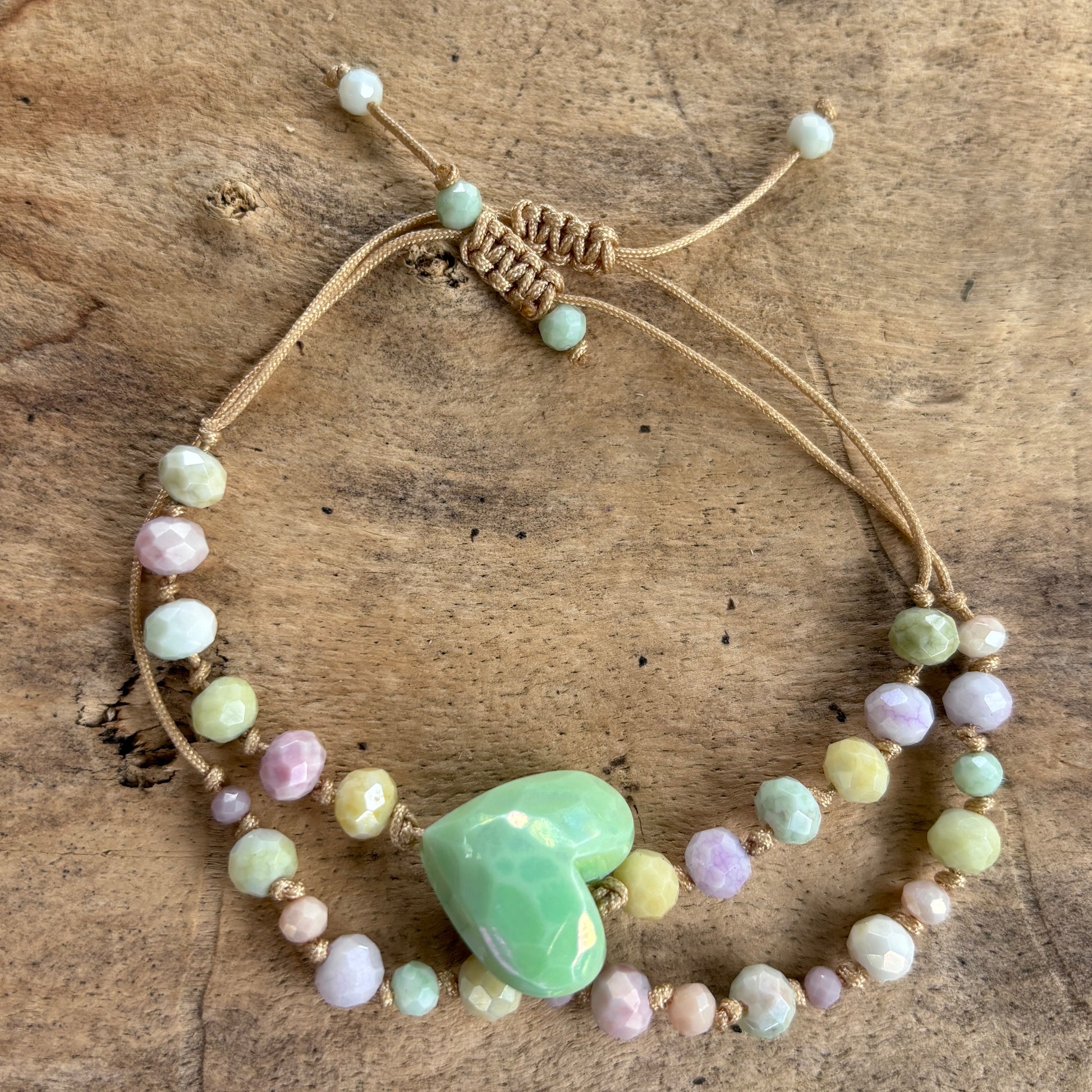 Set of two glass bead bracelets with a big green heart charm in the middle.