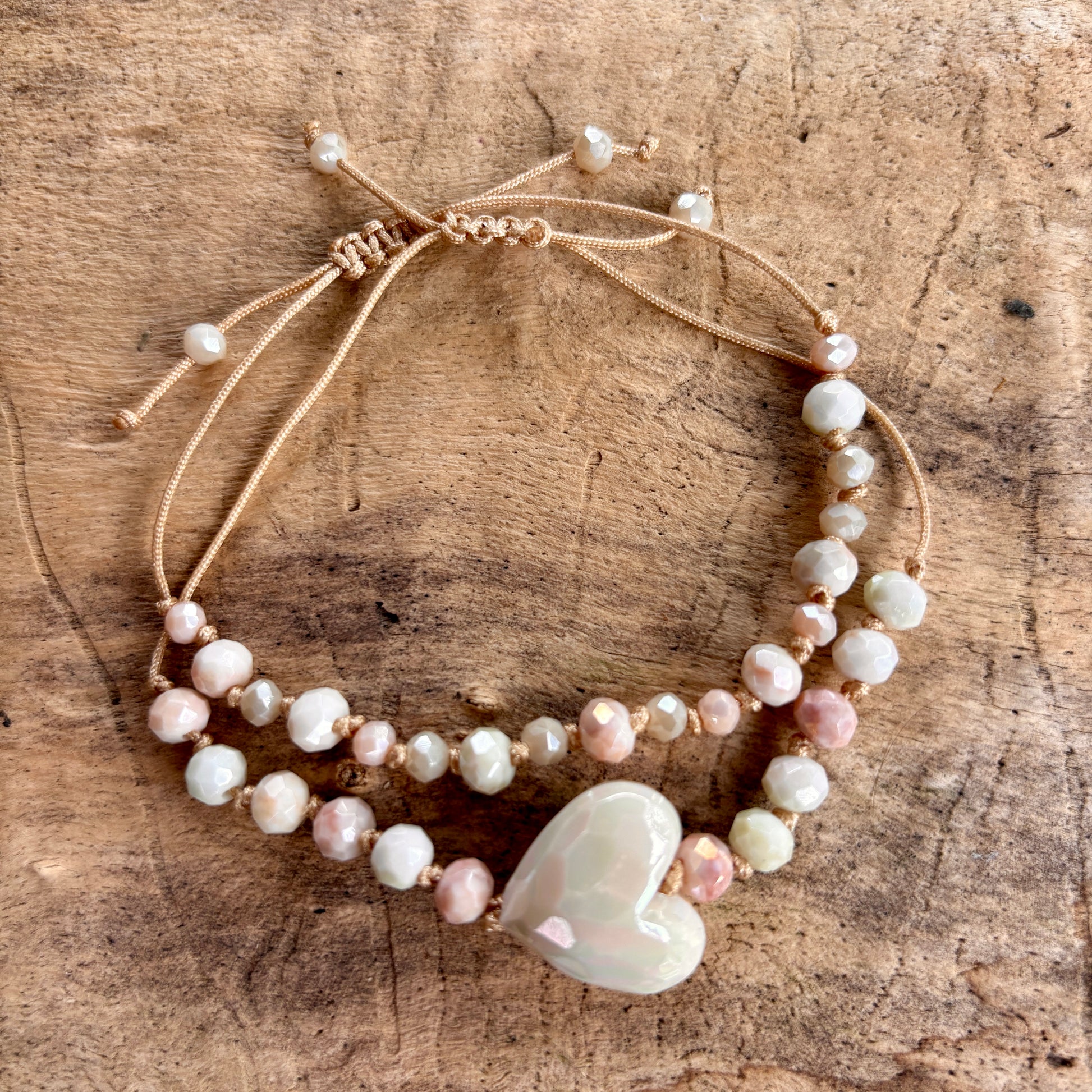 Set of two glass bead bracelets with a big pearl white heart charm in the middle.