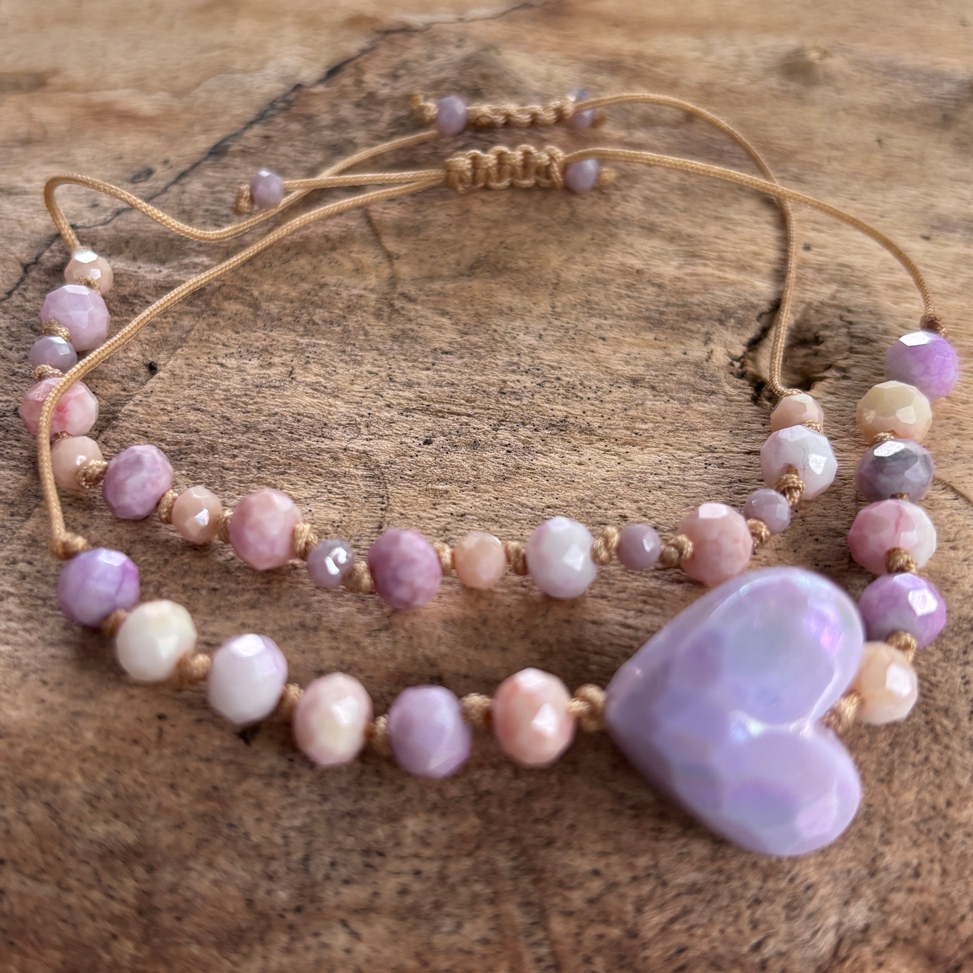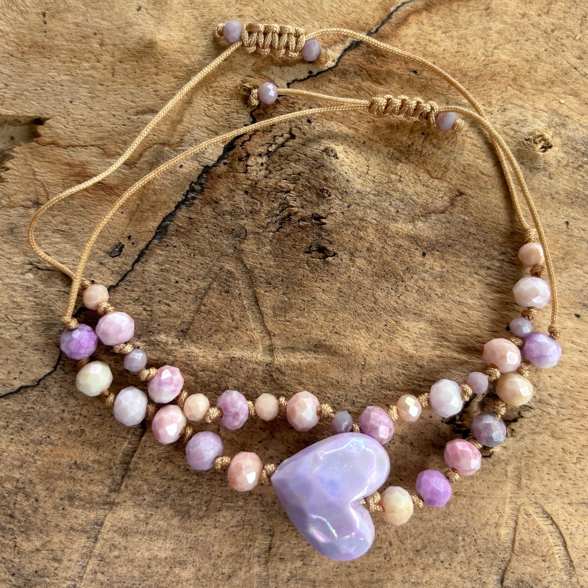 Set of two glass bead bracelets with a big light purple heart charm in the middle.