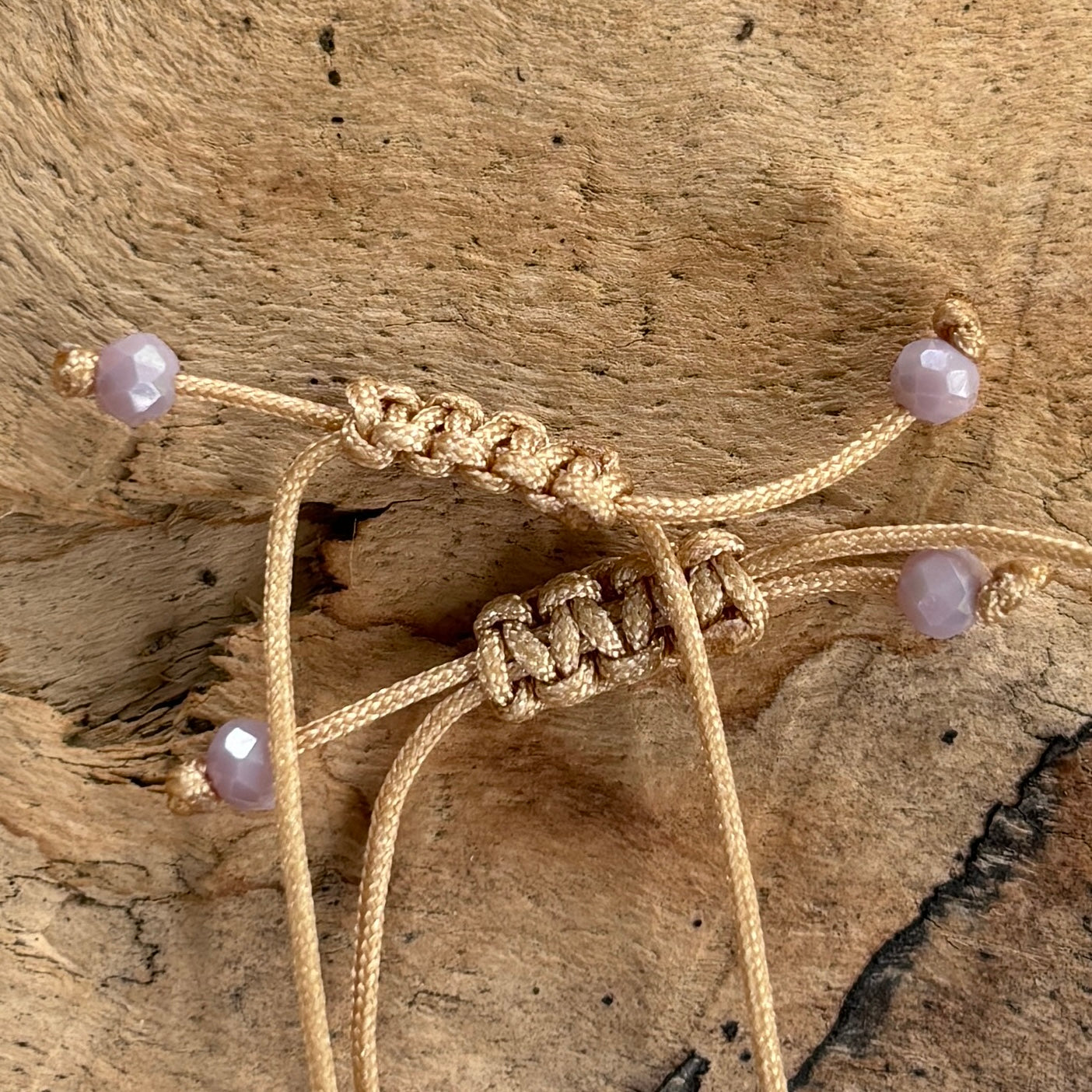 Tan gold string, knotted, glass beads, with a big heart charm. These bracelets have an adjustable sliding knot. max 23 cm