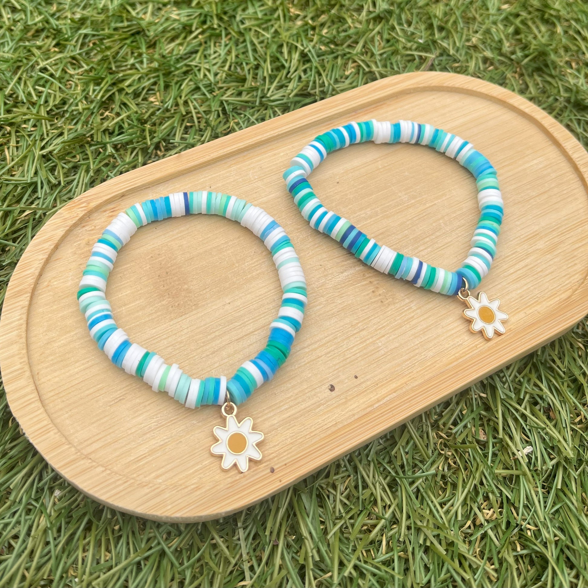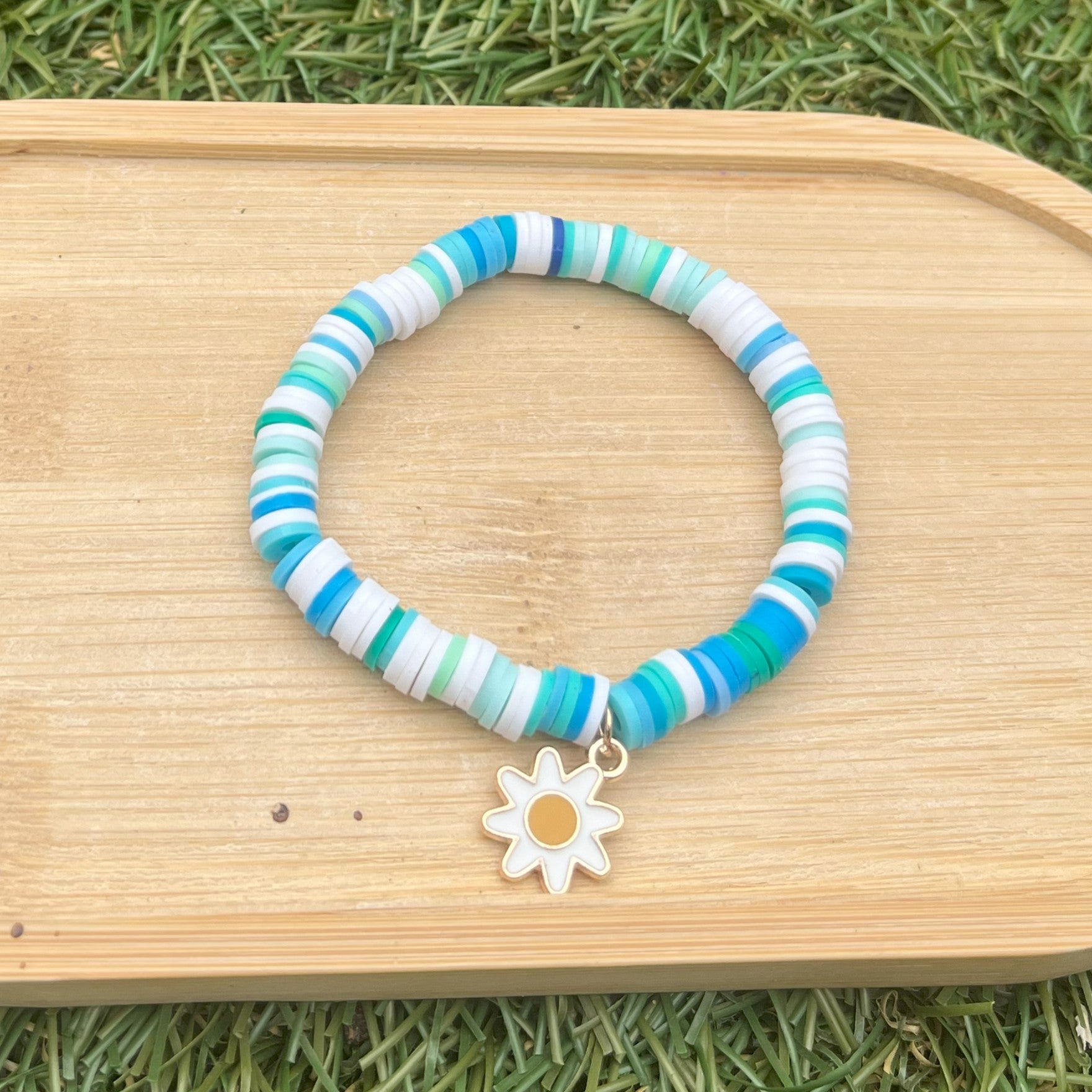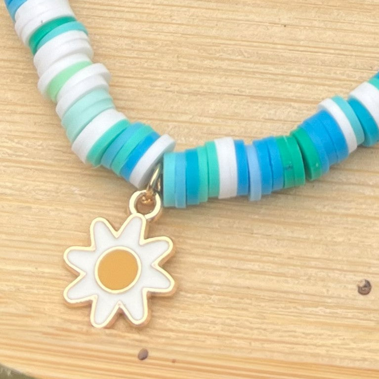 Single clay bead bracelets in the blue, green, and white colors of fresh sea water. The bracelets have a happy little daisy flower metal charm.