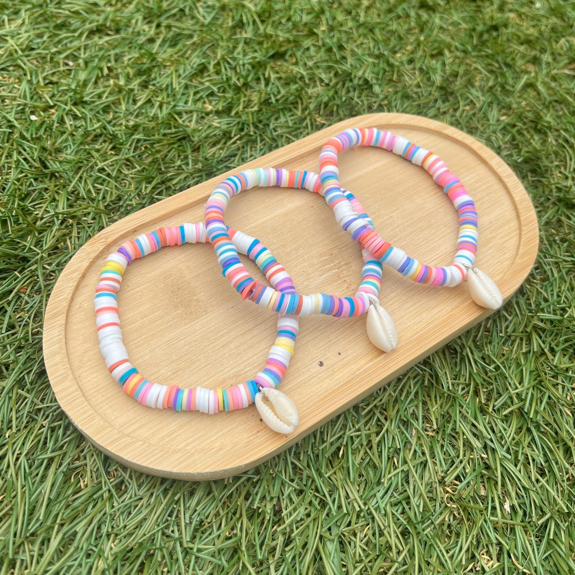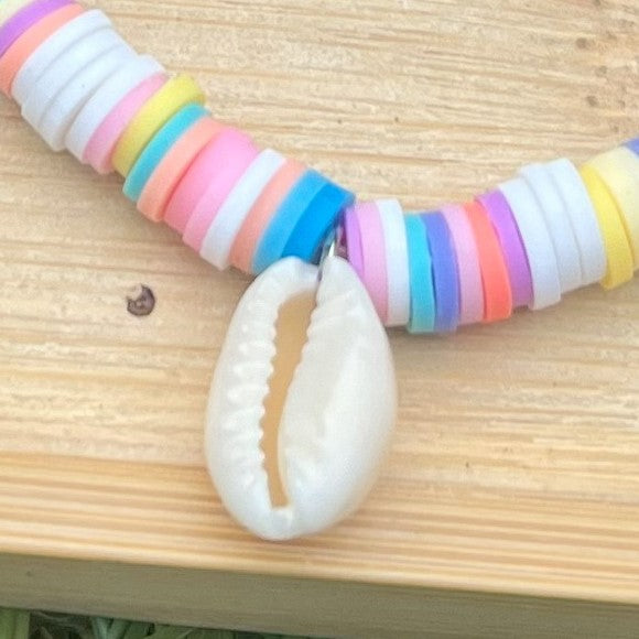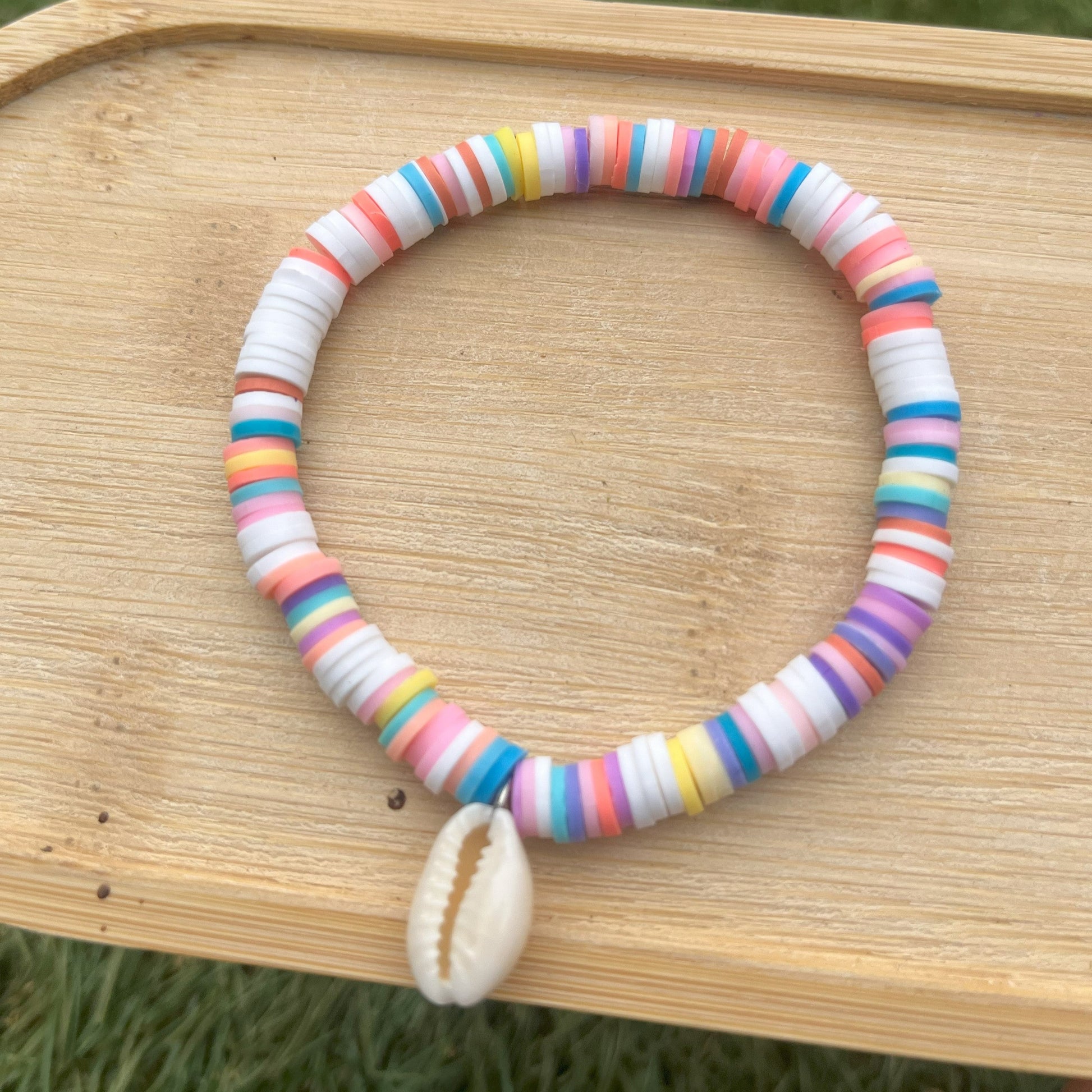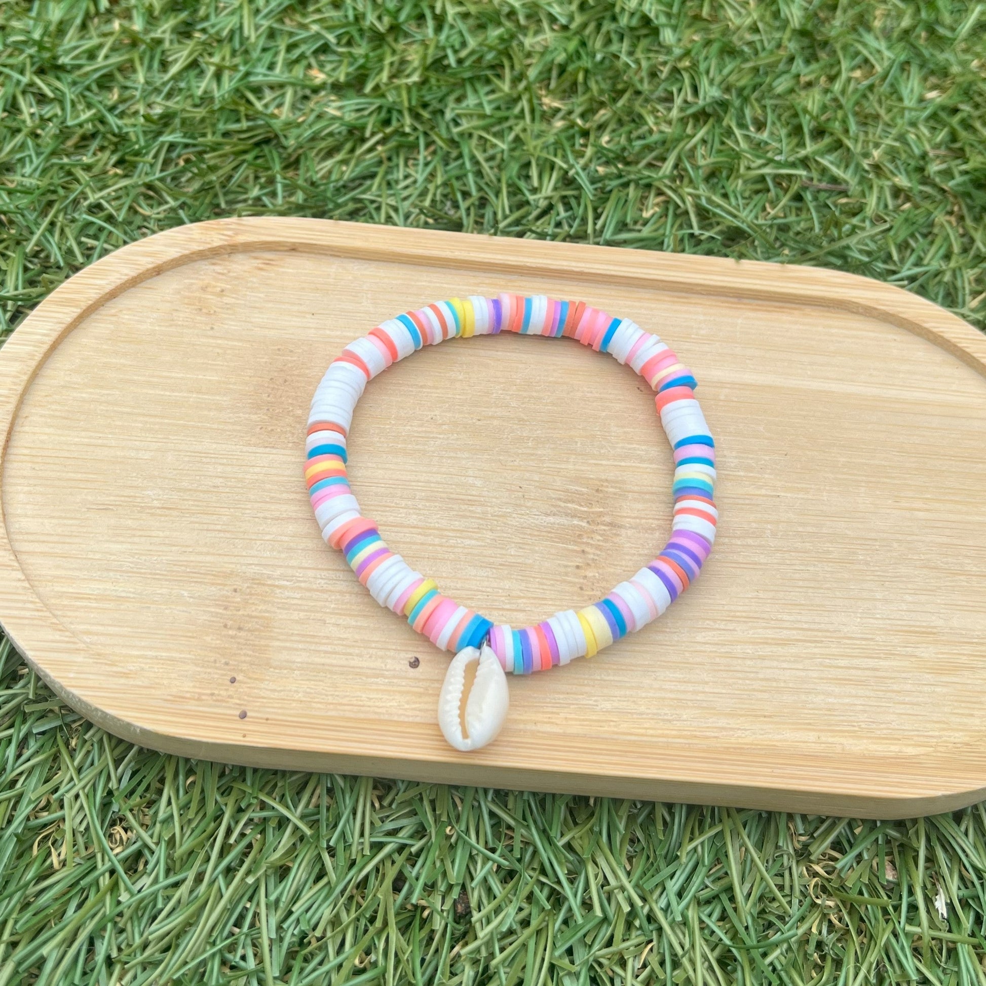 Single clay bead bracelet in summer colors, with a seashell charm.