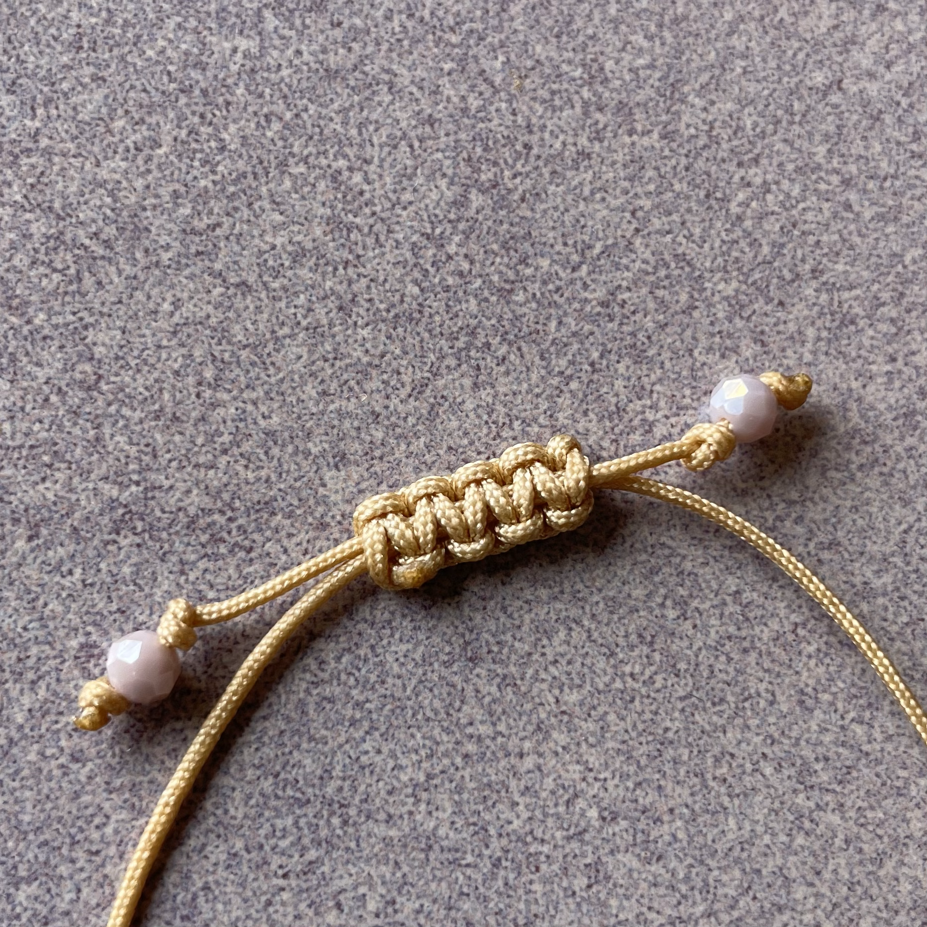 Tan gold string, knotted, glass beads, and an adjustable sliding knot. max 23 cm