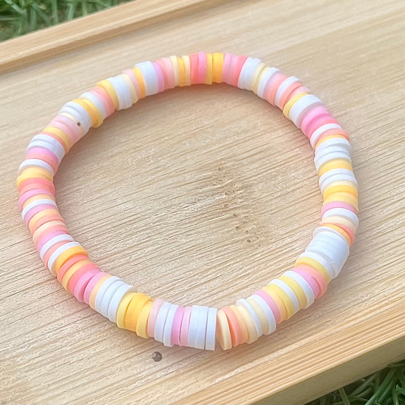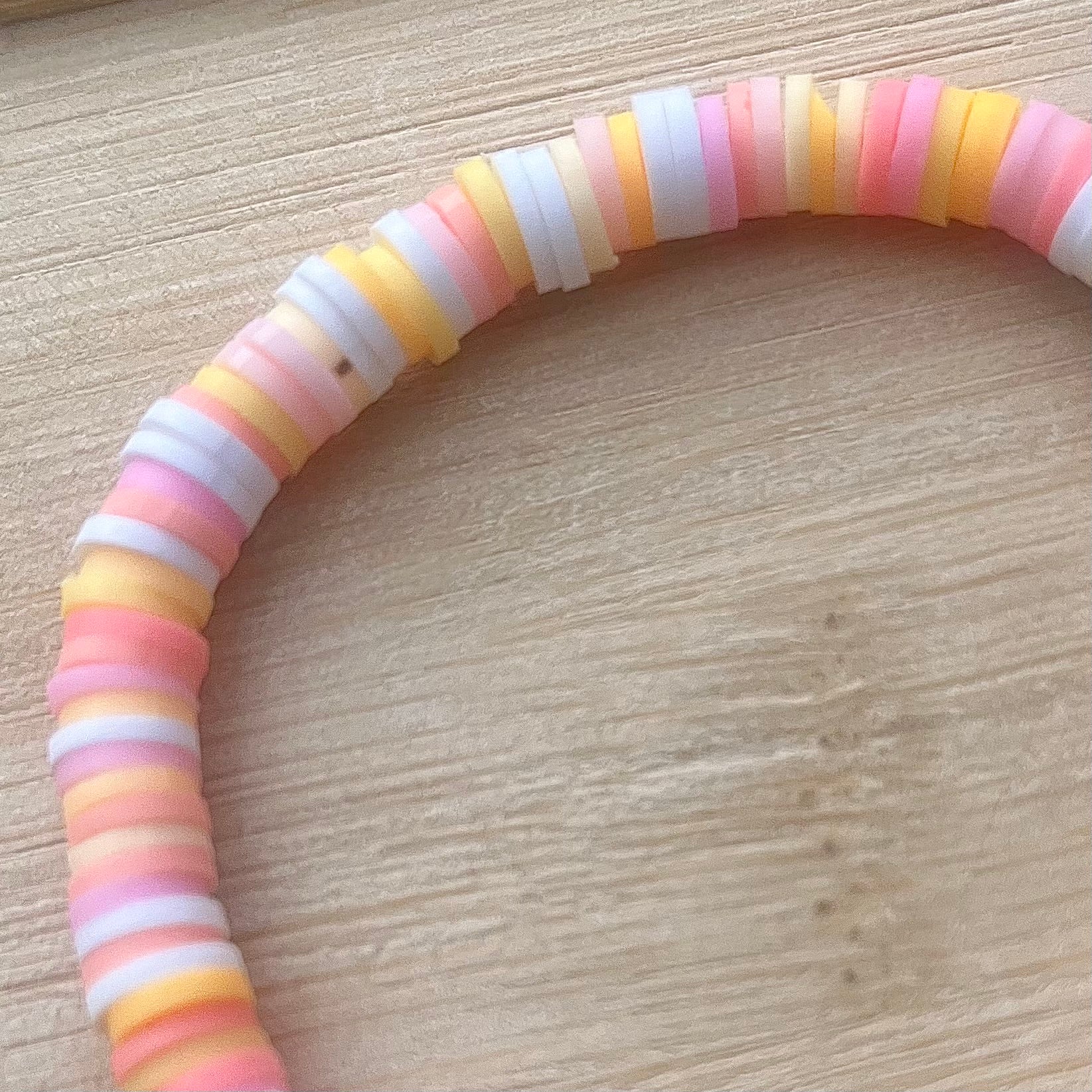 Single clay bead bracelet in yellow white and pink hues that remind me of the summer sun.